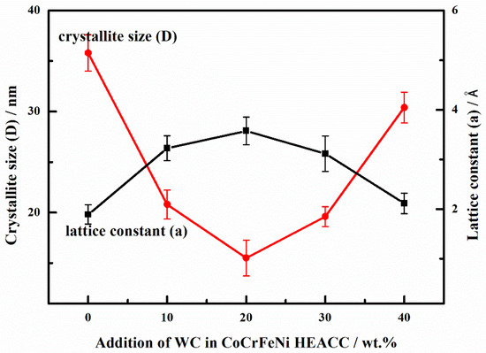 In order to investigate the influence of WC addition on the lattice structure of CoCrFeNi HEACC, we calculated the crystal size D and lattice constant an using the Scheler formula and Bragg Equation [40,41]. The corresponding results are shown in Table 3.