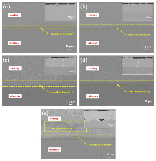 Figure 5 illustrates the backscatter image of the coatings specimen. As shown in the Figure 5a–d, there is a transition zone between the coating and the substrate. With the addition of WC, the transition zone expands and is typically located between 10 and 20 µm. It is evident that the bonding surface between the CoCrFeNi HEACC and the matrix is relatively smooth when the WC content is less than 40 wt.%, indicating that both CoCrFeNi HEACC and substrate are mutually soluble to ensure good bonding.