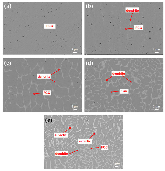Figure 6 illustrates the local magnification of the backscatter images of the coatings specimen. Accordingly, it is evident from the figure that when WC was added, bright white dendrites appeared in the coating (Figure 6a,b), further increased after the addition of 20–30 wt.% WC (Figure 6c,d), and finally formed a eutectic mixture with the HEA matrix after 40 wt.% WC was added (Figure 6e). When adding excess WC in the coating, the area of the diffusion layer became larger. This may be due to the large amount of WC melting at a higher temperature making the element diffuse in the molten pool when the mobile laser power is used for cladding. In turn, the coating becomes more uniform. In addition, it can be clearly seen in Figure 5e that there are a large number of cracks and holes in the coating, and there are fluctuations in the bonding surface, which are related to the higher energy required by excessive WC melting. It is also necessary to redesign the laser power and other parameters to minimize the effects of excessive WC on molten pool morphology.