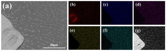 Figure 7. EDS element mapping of CoCrFeNi HEACC (40 wt.% WC). (a) SEM image of CoCrFeNi HEACC (40 wt.% WC); EDS element mapping of CoCrFeNi HEACC (40 wt.% WC): (b) C; (c) Cr; (d) Ni; (e) Fe; (f) Co; (g) W.