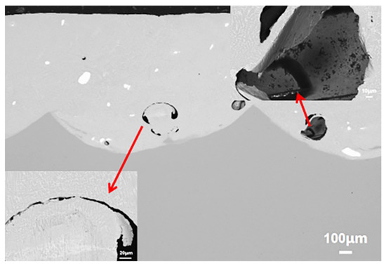 Figure 8 illustrates the morphology of cracks and holes in order to provide a better understanding of these phenomena. Based on the FESEM results, it is obvious that the semi-arc crack in the coating is typical of liquefaction cracks, which are formed when the eutectic at the grain boundary is remelted during the laser cladding process, resulting in inner granular cracking related to shrinkage, and finally bending and expanding [43,44]. The hole in the coating is caused by the poor adhesion between excessive WC particles and the CoCrFeNi HEACC, which causes the particles to fall off during the metallographic preparation process.