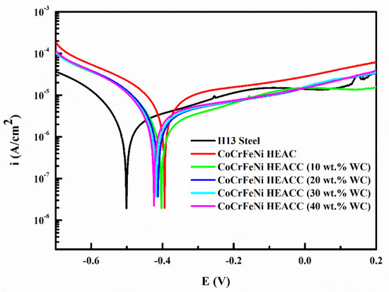 The corrosion potential (Ecorr) and corrosion current density (Icorr) of CoCrFeNi CoCrFeNi HEACC are nearly similar after the addition of WC, and the corrosion potential shows a slight decrease, which indicates that WC has little impact on corrosion resistance.