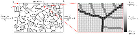 The primary and secondary GBs differ by the magnitude of the diffusion coefficient. The primary GB diffusion coefficient is a defined property Dgb of the simulated case. Diffusivities of the secondary GBs are expressed through the intensity of their gray color (Figure 2) and their diffusion coefficients are calculated from the grayscale number according to expression (2).