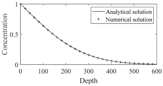 The developed model implementation was verified for a monocrystal material against the analytical solution of Fick’s second law (Equation (1)). Analytical and numerical solutions of vertical diffusant profiles in the semi-infinite slab case were compared. Obtained correspondence between the analytical and numerical results (Figure 2) demonstrates a correct implementation of the model.