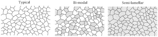 The typical microstructure is the most commonly found polycrystalline morphology. It is composed of solid grains of similar sizes and shapes separated by primary GBs only [45]. Bi-modal morphology also has the same distribution of grains and primary GBs as typical, but a fraction of grains also contains secondary GBs, while other grains do not, and some are partially filled [55]. Secondary GBs have no preferred orientation. Semi-lamellar morphologies have the same distribution of grains and primary GBs as typical, but all grains also contain secondary GBs [52].
