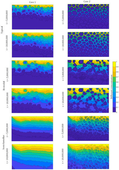 During the performed simulations the diffusion process in the coatings with the selected polycrystalline morphologies was modeled. An example of obtained results is presented in Figure 4 where concentration distributions of diffusant at selected instances of t = 5,000,000 and 10,000,000 are shown for Cases 1 and 2, and typical, bi-modal, and semi-lamellar morphologies (surface at the top). No morphological distribution is shown in Figure 4, which graphically shows whether morphology affects diffusion by preferring a diffusant path to GB or not. Therefore, it creates (or not) a pattern similar to a simulated case of morphology. The same progression of diffusion into the material from the surface was observed in coatings of all morphologies. Since diffusion coefficients were selected with significantly higher values in GBs compared to grain interiors, diffusion mostly progressed through the primary GBs, with slower diffusion occurring at secondary GBs. Diffusion into the grain interiors from the surface and GBs was significantly slower than along the GBs.