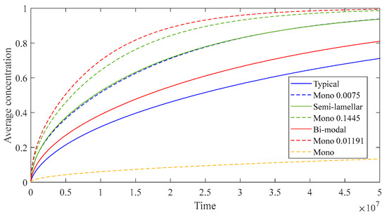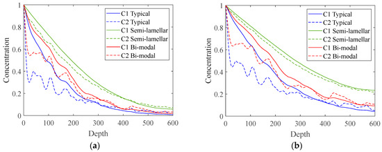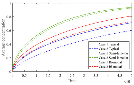 Several time moments of averaged concentration profiles are given in Figure 7 for Case 1 typical and Case 2 bi-modal morphology coatings. Curves tend to become smoother over time. It is apparent that the Type-A regime remains, while Type-B tends to switch to Type-A and Type-C shifts to Type-B. However, in Case 2 bi-modal morphology, further peaks, e.g., in between 100 and 200 depths, become greater, which indicates a local reversal and more pronounced Type-B or even Type-C regime.
