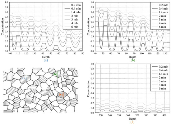 The Type-A regime corresponds to long diffusion times, grain diffusion coefficient not much greater than in GBs or smaller grains. However, as is shown below, Type-A regime is also facilitated by a higher density of secondary GBs. From the three presented cases, Type-A regime most clearly can be observed in Case 1 semi-lamellar morphology, which has the highest agb. This regime is distinguished by the insignificant differences between bulk and GB concentrations (Figure 4). The presence of Type-A regime is as well confirmed by the averaged concentration profiles (see Figure 5), which are also dependent on the dominant kinetic regime. Case 1 semi-lamellar curves are smooth, indicating no local effect of GBs, while every other case has greater or smaller peaks at depths where the grain boundary density is higher.