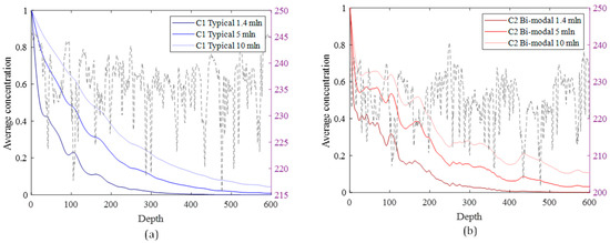 Averaged concentration profiles of (a) Case 1 Typical and (b) Case 2 Bi-modal morphologies (fray dashed line—layer average grayscale number).