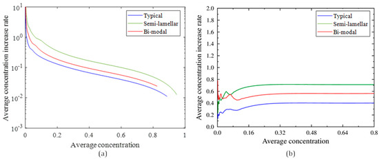 Figure 9a shows the dependency of the average concentration increase rate on the average concentration for all coatings. As could be expected, the average diffusion rate is higher in morphologies with a larger total diffusivity. Ratios of diffusion rates in these morphologies (Figure 9b) are practically constant when the average concentration is in the range of 0.4–0.7. Therefore, it is possible to compare averaged diffusion rates for these morphologies by taking values at the same selected average concentration from this range.