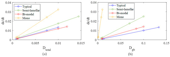 Figure 10 shows dependencies of the integral diffusion rate on Dtotal and Dgb at an average concentration of 0.5 for all morphologies (Dgb/Dg = 1000) and monocrystal cases. Linear dependencies are obtained, with proportionality coefficients depending on the morphology and the selected average concentration. As expected, in dependency on Dgb case, bi-modal morphology is between the typical and semi-lamellar morphologies, since it is the intermediate microstructure. However, when dependency against the Dtotal is examined, typical morphology seems to be more efficient than bi-modal. This result shows that the overall diffusion rate is not solely determined by the total diffusivity Dtotal, but results from a complex relationship between the Dtotal, Dgb, and distribution of primary and secondary GBs. To obtain higher total diffusivities in typical morphology, which does not contain secondary GBs, significantly higher Dgb values are needed. Moreover, it is these high Dgb values which then make overall diffusion faster in typical morphology than in the bi-modal morphology at the same Dtotal. However, diffusion is the fastest in semi-lamellar morphology, regardless of the lowest Dgb values required for the same Dtotal, showing that the relative importance of Dtotal or Dgb depends greatly on the morphology features and density of secondary GBs.