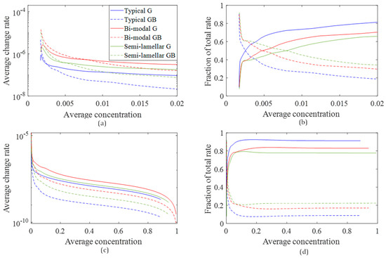 Figure 11 shows the dependence of overall concentration change rate on average concentration separately in grains and GBs in all three materials as an absolute value (Figure 11a,c) and as the fraction of total rate (Figure 11b,d) at the beginning of the transient (Figure 11a,b) and during the whole duration (Figure 11c,d). All three coatings differ only by the presence of secondary GBs: typical has none, semi-lamellar has secondary GBs in all grains, and bi-modal in approximately half of the grains. Figure 11 shows that diffusion is initially dominated by the GB transport in all morphologies. However, very soon, it is overcome by grain diffusion due to a larger volume of the material taken up by grains. The concentration at which grain diffusion starts to dominate increases with the increasing volume of secondary GBs. Moreover, with the increasing volume of secondary GBs, the dominance of grain diffusion decreases from about 0.9 (typical) to 0.78 (semi-lamellar). It is interesting to note that this ratio does not change for most of the duration of the transient, confirming the self-similar character of diffusion deeper in the material even if its microstructure is not idealized.