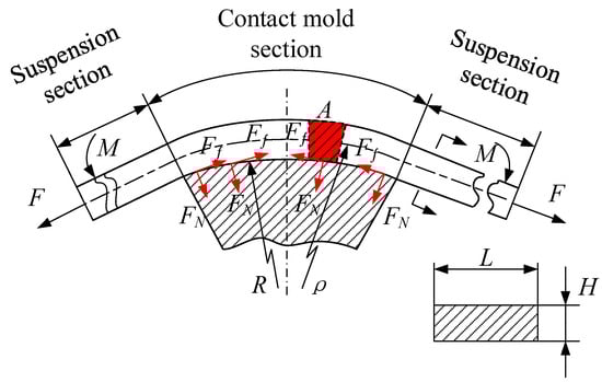 The force in the stretch-bend forming process is shown in Figure 1. In the figure, F is the axial tension force; R is the radius of the mold; ρ is the bending radius of the neutral layer of the profile; M is the total bending moment; Fƒ is the frictional force on the contact mold segment, and the direction is along the tangent direction of the mold arc; FN is the positive pressure of the profile on the mold, and the direction is perpendicular to the contact surface.