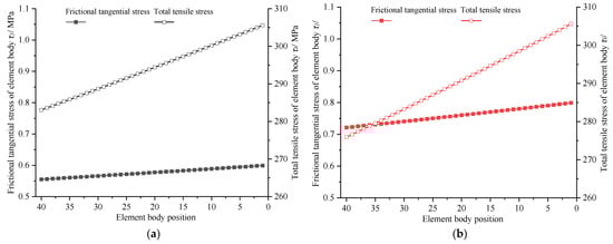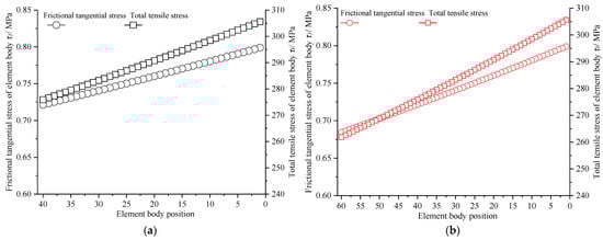 It can be seen from Figure 3 that the rightmost micro-unit is subjected to frictional shear stresses of 0.599, 0.799, and 0.99 MPa, respectively, when the friction coefficients of contact sections are 0.15, 0.2, and 0.25, respectively. The normal pressure of the micro-unit from right to left gradually decreases, resulting in a lower frictional force on the micro-unit at the same friction coefficient. As the friction coefficient increases, the frictional shear stress on the micro-unit at the same position becomes larger. It is known that the magnitude of the frictional shear stress of the micro-unit is related to the friction coefficient and the position of the micro-unit. That is, the smaller the coefficient of friction, the farther the location of the micro-unit from the point of tension is, and the smaller the frictional shear stress on the micro-unit is.