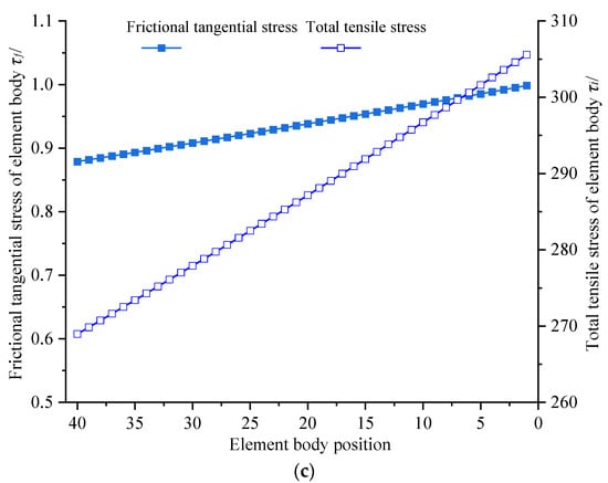 The frictional tangential stress and total tensile stress of each micro-unit under different friction coefficients. (a) μ = 0.15; (b) μ = 0.2; (c) μ = 0.2.