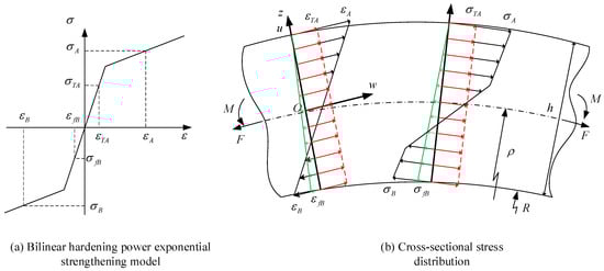 Stress–strain distribution of the stretch-bend section. (a) Bilinear hardening power exponential strengthening model; (b) cross-sectional stress distribution; where, is the neutral layer coordinate system; and are the total stress and total strain of the section, respectively; and are the total stress and total strain of the outermost layer of the section, respectively; and are the frictional shear stress and strain of the contact interface between the inner layer of the section and the mold, respectively; and are the total stress and total strain of the innermost fiber, respectively.