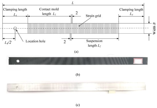 To explore the plastic deformation during the simultaneous tensile-bending loading phase, combined with the mechanical properties of the experiment specimen, we ensured that the specimen entered the plastic deformation stage and was not pulled off. Three types of stretch-bend specimens were made according to the different contact mold angles, as shown in Table 4. To analyze the strain variation of the specimen in the length direction, the specimen needs to be pre-treated as follows: (1) a flexible film is sprayed on the upper surface of the specimen, and no flexible film is sprayed on the down surface; (2) the strain measurement grid lines with 2 mm spacing were laser engraved in the deformation area of the specimen to form a strained grid as shown in Figure 7. The laser-engraved strain grid lines are of high accuracy and consistency while not damaging to the specimen itself. Since the flexible film can plastically deform and elongate synchronously with the specimen, the deformation amount of the specimen strain element can be obtained by measuring the grid width of the flexible film after laser engraving.