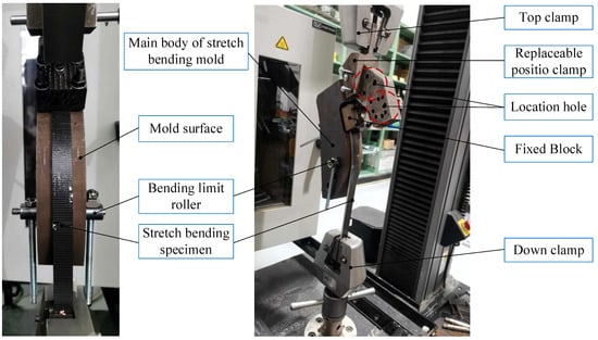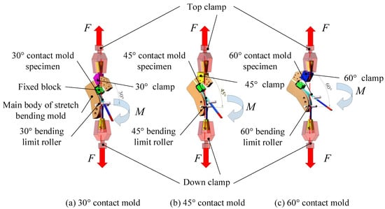 To further analyze the effects of contact friction and contact mold angle on plastic deformation of stretch-bend specimens, the equivalent stretch-bend experiment was carried out on the tensile testing machine by auxiliary tooling. The equipment of the equivalent stretch-bend experiment is mainly composed of the main body of the stretch-bend mold, replaceable upper clamp, bending limit roller, fixed block, and other parts, as shown in Figure 8. The replaceable clamp and bending limit rollers can be used at the same time to achieve three types of contact mold angle of bending experiments as shown in Figure 8. The suspension section and the tensile axis of the specimen were ensured to be in the same straight line.