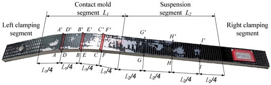 The specimen after stretch-bend is shown in Figure 10. The micrometer was used to measure the width of the upper and lower edges of the three equal cross-sections , , and of the specimen contact mold segment and the three equal cross-sections , , and of the specimen suspension segment. The measurement accuracy of micrometer was ±0.001 mm. The strain grids of the contact mold segment and the suspension segment of the specimen were measured one by one in the tensile direction with a 40× light microscope, and the plastic deformation of the strain mesh was calculated. The measurement accuracy of optical microscope was ±0.001 mm. The measurement accuracy was less than an order of magnitude of plastic deformation, so the measurement error did not affect the analysis of plastic deformation results, and had certain credibility.