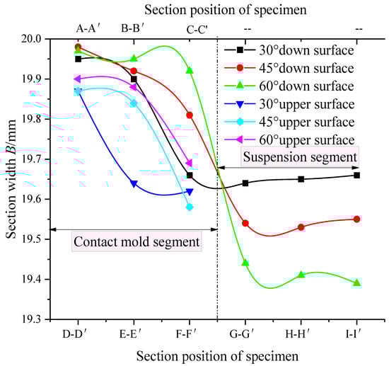 Figure 11 shows the width change curve of the upper and lower edges of the specimen cross-section with a smooth mold stretch-bend. It can be seen from Figure 11 that with the 30° contact mold stretch-bend, the upper surface deformed widths of the contact mold segment , , and cross-sections were 19.87, 19.64, and 19.62 mm, respectively, while the lower surface deformed widths were 19.95, 19.90, and 19.66 mm, respectively. In Figure 11, the deformed widths of the upper and lower surfaces of the left cross-section were between 19.87 and 19.98 mm, and the deformed widths of the upper and lower surfaces of the rightmost cross-section were between 19.58 and 19.2 mm. That is, the width of the upper surface of the specimen was smaller than the width of the lower surface at the same cross-section position of the contact mold segment, and the width of the section from left to right decreased gradually. It should be noted that the deformation of the upper surface was much larger than that of the lower surface in the stretch-bend forming process. The closer to the action point of the tensile force, the greater the overall deformation of the section is. There was no width difference between the upper and lower surfaces in the cross-section of the suspension segment. The width of the neutral layer cross-section can be used for characterization. However, due to the inhomogeneity of the material, there was a slight fluctuation in the width of each cross-section of the suspension segment.