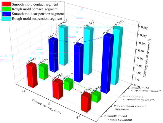 The cross-sectional shrinkage rates of each section of the specimen contact mold segment and the suspension segment were averaged. The distribution of the cross-section shrinkage changes of both the specimen contact mold segment and the suspension segment under different contact mold angles is plotted as shown in Figure 14. It can be found from Figure 14 that with the contact mold angle of the specimen increased from 30° to 60°, the cross-section shrinkage rate in the contact mold segment of the smooth contact surface and rough contact surface decreased by 32.8% and 49.2%, respectively, and the cross-sectional shrinkage rate in the suspension segment increased by 60.7% and 35.3%, respectively. It can also be seen from Figure 14 that at 30°, 45°, and 60° contact mold angles, the smooth mold had an increase of 38.3%, 47.7%, and 53.4%, respectively, in the cross-sectional shrinkage rate of the contact mold segment compared with the rough mold. This is due to the increase of the contact mold angle of the specimen, making the total amount of friction resistance superposition in the contact mold segment become larger. As a result, the plastic deformation of the specimen contact mold segment was reduced, and the corresponding deformation of the suspension segment increased. The angle of the contact mold is inversely proportional to the shrinkage of the cross-section of the contact mold segment and positively proportional to the shrinkage of the suspension segment.