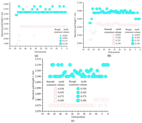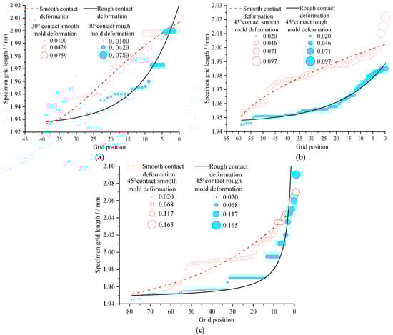 Strain grid length and deformation distribution of the contact mold segment. (a) 30° contact mold angle; (b) 45° contact mold angle; (c) 60° contact mold angle.
