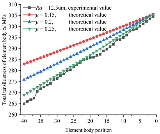 It can be seen from Figure 3 that the total tensile stress on the rightmost micro-unit for all three friction coefficients was 305.577 MPa. From right to left along the direction of the bending arc, the total tensile stress experienced by the micro-unit showed a significant decrease. Since the order of frictional shear stress is much smaller than the tensile stress in the micro-unit cross-section, it is known from Equation (5) that the tensile stress in the micro-unit was . The superimposed accumulation of frictional shear stress makes the tensile stress in the bending specimen unevenly distributed.