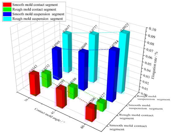 The elongation of the strain mesh of the micro-unit in the contact segment and the suspension of the specimen were counted, respectively. The tensile elongation distribution of the contact mold segment and the suspension segment with different contact mold angles was plotted as shown in Figure 18. It can be seen from Figure 18 that with the contact mold angle of the specimen increasing from 30° to 60°, the elongation of the contact mold segment of the smooth contact surface and rough contact surface decreased by 39.9% and 45.3%, respectively, and the elongation of the suspension segment increased by 55.2% and 40.8%, respectively. It can also be seen from Figure 14 that at 30°, 45°, and 60° contact mold angles, the smooth mold had an increase of 32.3%, 36.1%, and 38.3%, respectively in the elongation of the contact mold segment compared with the rough mold.