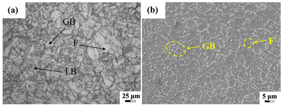 The BM used in this study is a kind of high-strength low-carbon bainitic steel (ASTM A1066/A1066M); the hot-rolled state and the ER80YM filler wire with a diameter of 1.2 mm were used. Their chemical compositions are given in Table 1, and the micro-morphology of the BM is shown in Figure 1. The microstructure and grains are small, with a size of about 5–20 μm, mainly lath bainite (LB), granular bainite (GB), and ferrite (F), of which the LB is intermittently distributed in Figure 1. The basic mechanical properties of the BM are shown in Table 2.