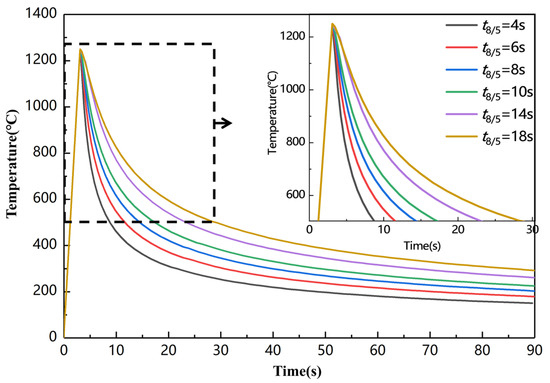 Test thermal cycle curves at different t8/5 values of Tmax = 1250 °C.