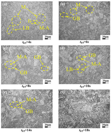 Different t8/5 thermal simulations of the HAZ microstructure (OM) when Tmax = 1250 °C. (a) t8/5 = 4 s; (b) t8/5 = 6 s; (c) t8/5 = 8 s; (d) t8/5 = 10 s; (e) t8/5 = 14 s; (f) t8/5 = 18 s.