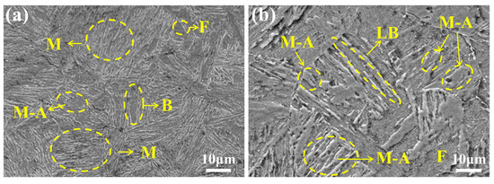 The SEM microstructure at t8/5 = 4 s and t8/5 = 18 s at Tmax = 1250 °C is shown in Figure 6. When the cooling rate was fast, many lamellar martensite constituents and LB appeared in the microstructure, and some AF was distributed among them. M-A constituents were dispersed in the ferrite matrix, with a small content and small granular appearance. When the cooling rate was slightly slow, the M-A constituents appeared in the agglomerated GB, and its content increased significantly, mainly in the form of strips. Meanwhile, lamellar martensite and LB gathered at the adjacent grain boundary.