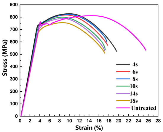 The strain–stress curves of the thermal simulation specimens with a peak temperature of 1250 °C and different t8/5 values are shown in Figure 8, and the effect of the t8/5 value on the tensile properties is summarized in Figure 9. As shown in Figure 8 and Figure 9, when t8/5 was shorter than 14 s, the yield strength and elongation of the thermal simulation specimen were both lower than those of the BM. When the cooling rate was the highest, namely, t8/5 = 4 s, the elongation of the specimen was 19.57%. Due to the incomplete austenitizing transformation, many hardened M constituents were generated in the microstructure. When t8/5 = 6 s, compared with t8/5 = 4 s, the elongation of the specimen was significantly reduced to 17.87%. As the cooling time increased, the austenitizing process gradually began, and the M-A constituents generated in the microstructure began to increase, so the toughness of the material decreased [21]. The elongation showed a downward trend, which was related to the microstructure change of the material. With the decrease in the cooling rate, although the austenitizing transformation process was sufficient, the ferrite content increased, which was beneficial for the improvement of toughness. With the precipitation of ferrite, the generated LB and M-A constituents enriched many elements near the grain boundary, resulting in the formation of a mixed structure. During the gradual decrease in the grain size, the content of M-A constituents increased, which were mainly distributed near the grain boundary [22], thereby negatively affecting the plasticity of the material and further reducing the elongation. The content of AF and the M-A constituents affected the toughness of the steel [23], but it was obvious that the M-A constituents played a leading role as shown in Figure 8, i.e., that the stress between 6 s and 8 s did not follow the tendency as well as the point ‘t8/5 = 8 s’ in Figure 9. To optimize the welding process, when t8/5 = 6 s, the yield strength of the CGHAZ was 716 MPa, and the tensile strength exceeded that of BM, reaching 817 MPa. Therefore, it is very important to optimize the CGHAZ to obtain high-quality welding joints.