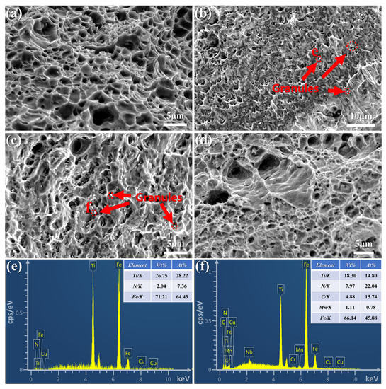 The fracture appearance: (a) BM dimple; (b) t8/5 = 6 s dimple magnification; (c) enlarged image of the t8/5 = 8 s dimple; (d) enlarged view of the t8/5 = 18 s dimple; (e,f) EDS analysis of particles presented in (b) point e and (c) point f, respectively.