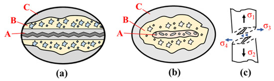 Schematic diagram of the fracture morphology distribution: (a) quasi-cleavage fracture; (b) quasi-cleavage fracture with few brittleness characteristics; (c) schematic diagram of the fracture. (A, B, and C represent the crack origin area, radiation area, and fracture area, respectively, i.e., the three areas of the cross section from inside to outside; σ1, σ2, σ3 and σ4 mean different directions of different stress).