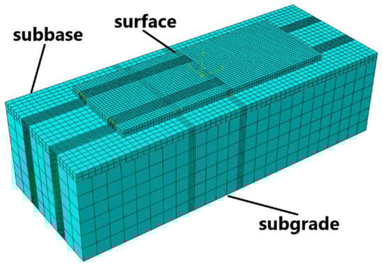 The following principles were proposed during the simulation process: (1) the cement concrete pavement slab is a small deflection elastic sheet with uniform material, as specified in the design specification; (2) the subgrade under the surface slab is set with the equivalent Winkler foundation model, and the “Elastic Foundation” contact form in contact analysis is used to simulate the Winkler foundation model below the subgrade [30]; (3) the plane size of the base layer and the foundation model are both larger than that of the pavement slab, and it is assumed that they satisfy the infinitely large foundation model specified in the specification; (4) the interlayer contact mode is completely continuous, and the constraint type of the structural layer is simulated according to the actual constraint form [31]. The material design parameters and model of each structural layer are shown in Figure 1 and Table 3 [32].