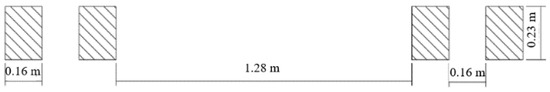 The type of load action adopted in this simulation is the standard axle load of uniaxial double wheel group. According to the principle of load stress equivalence, the uniformly distributed load of the double circle can be converted into the rectangular load to simplify the meshing [33]. The axle weight is 100 KN, and the pressure of pneumatic tire is 0.7 MPa. The length–width ratio of the tire is 1.44. After conversion, the tire size is 0.23 m × 0.16 m, and the load action diagram is shown in Figure 2 [30].