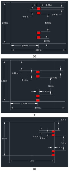 The load position as applied to different critical load position. (a) Middle; (b) edge; (c) corner (unit: m).