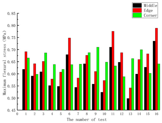 The influence of size on the maximum flexural stress of a slab is shown in Figure 6. Figure 6 shows that, by comparing the maximum stress under different sizes—during test numbers 1, 2, 5, 6, 11, 12, 15 and 16, as well as when the thickness was 0.22 m or 0.24 m—the maximum flexural stress reached the maximum under standard axle load on the slab edge. In test numbers 3, 4, 7, 8, 9, 10, 13 and 14, as well as when the slab thickness was 0.26 or 0.28 m, the maximum flexural stress reached the maximum under standard axle load on the slab corner.
