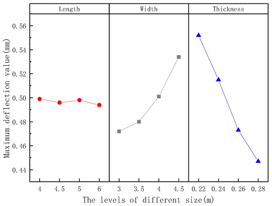 The influences of different factors such as length, width and thickness on the slab maximum deflection value are shown in Figure 7. It shows that when the maximum deflection of the slab is considered as the mechanical response index, the most unfavorable load position for maximum deflection value is the slab corner. By calculating the average value of different factors at different levels, the variation trend of the maximum deflection value with different sizes is determined.