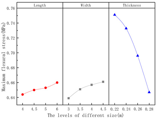 The influence of different size factors on the maximum flexural stress of the slab bottom is shown in Figure 8. It can be observed that the variation trend of the maximum flexural stress with the increase in size is determined by calculating the mean response index. The results show that the maximum flexural stress increases gradually with the increase in length, but the variation range is not large, and the limiting value is only 0.016 mpa. The index also increases gradually with the increase in the width, and the change range is also small. The variation rule with slab thickness is obvious and the flexural value is smallest compared to the others.