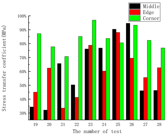The influence of different joint forms on the stress transfer coefficient is shown in Figure 10. By comparing the stress transfer coefficient with the different forms of joints, it shows that when the standard axial load is respectively applied to different positions of the slab, the coefficient value is significantly higher than the load acting on the corner. Selecting the corner is obviously not reasonable as an index for optimizing the form of the joints. When the load is applied to the middle or side of the slab, the stress load transfer coefficient has little difference under the same joint structure, and is generally less than the value of the corner.