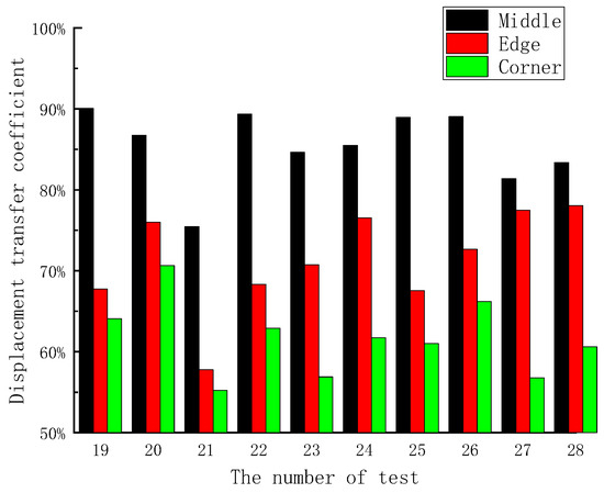 The influence of different joint forms on the displacement load transfer coefficient is shown in Figure 11. Through the comparison of the displacement load transfer coefficient of different load position under same joint forms, it can be observed that the displacement load transfer coefficient is at a maximum when the standard axle load acts on the middle of the slab, and it is at a minimum when the load acts on the corner.