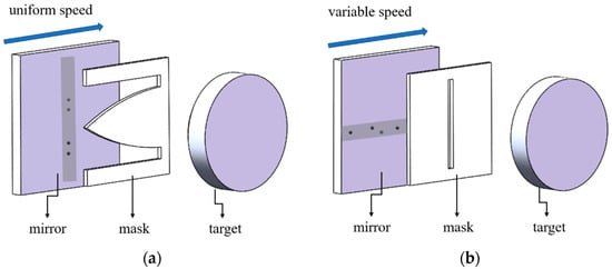 Mask-assisted magnetron sputtering, which uses film to compensate for surface deviations, is an effective method to correct the surface errors, simultaneously avoiding the artificial ripples in the surface caused by several correction loops. Many works have demonstrated the effectiveness of magnetron sputtering for surface correction. Ice first used the magnetron sputtering method to correct the elliptical curve figure on a 90 mm long cylindrical mirror by varying the sputter source power []. Since the power is not easy to be precisely controlled, Chian introduced the profile-coating method, as shown in Figure 1a, to improve the correction accuracy, and converted a cylindrical mirror to an elliptical Kirkpatrick–Baez (KB) mirror with an irregular mask, obtaining a one-dimensional figure error of 1.04 nm Root Mean Square (RMS) roughness. As the substrate moved at a uniform speed, the surface figure was mainly determined by the designed mask [,]. The advantage of the mask is also reflected in the differential-deposition method, as shown in Figure 1b. With this method, Kilaru used a silt mask to limit the deposition area on the surface to fabricate astronomical X-ray mirrors. The film distribution was controlled by the velocity of the substrate during the deposition process. The one-dimensional figure error was reduced from the initial 32.7 nm RMS to 6.2 nm RMS [,]. Morawe performed differential-deposition for the correction of the midline figure of a 300 mm-long flat mirror in 2021. The figure error was reduced by a factor of 5 to less than 1 nm RMS []. Kim used a narrower slit (2 mm) mask to fabricate a 100 mm-long mirror which showed a 0.31 nm RMS figure error [].