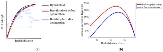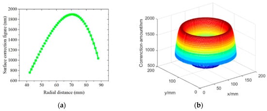 As the hyperboloid surface in this study was rotationally symmetric, the best-fit sphere was calculated using the profile of the hyperboloid in the radial direction. Figure 2a shows the difference between the best-fit spheres before and after optimization of the fitting method. As a result, the surface correction figures calculated by two methods are shown in Figure 2b. The size of the area under the curve demonstrates the advantage of optimization. Figure 3 shows the surface correction figure within the effective aperture (R = 42–88 mm) and the corresponding correction-amount distribution on the surface, respectively.