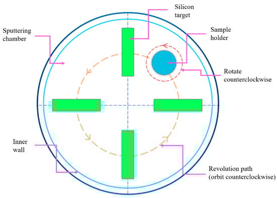 The experiment was carried out using a magnetron sputtering coating system with substrate planetary motion in this study. The use of such equipment is beneficial to avoid film thickness errors on the same circumference when the spherical surface is corrected to the rotational symmetric hyperboloid surface. As shown schematically in Figure 4, there are four rectangular magnetron sputtering targets, evenly distributed in the circular vacuum chamber and installed vertically upwards. Each target is equipped with a shielding sleeve to prevent mutual contamination between different sputtering materials during the coating process. The sample holder is placed vertically above the target and revolves around the main axis of the vacuum chamber. Meanwhile, the high-speed rotation function of the sample holder ensures the uniformity of the film deposited on the surface of the sample holder.