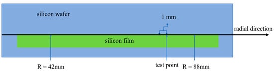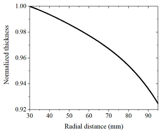 Before designing the mask, it is necessary to know the deposition distribution of the film on the sample holder without the mask. Due to the silicon film with a thickness of 2000 nm still having the advantages of low stress, better stability and less roughness [], in this study, we chose it as the material for profile coating. The deposition conditions are shown in Table 1. According to the previous experimental results in the laboratory, the radial film deposition distribution shown in Figure 5 can be obtained.
