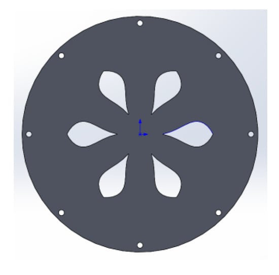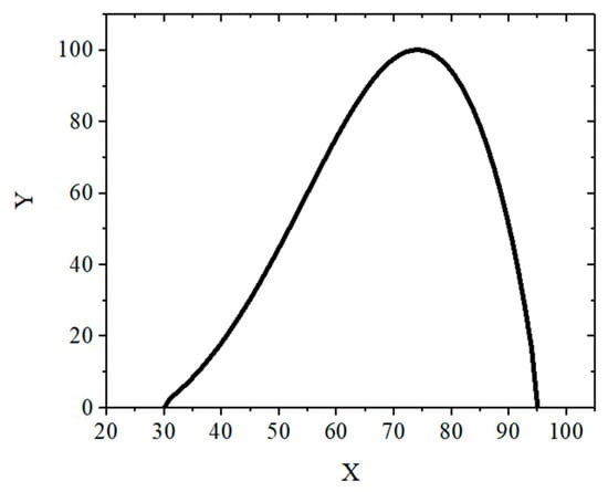 Then, the opening angle can be further converted into the coordinates of each position on the mask to facilitate fabrication. The opening area is equally divided into two symmetrical parts, and the corresponding center angle of each part is half of the total opening angle. In this way, the position coordinates of the edge of the opening angle at the radius of 30–95 mm of the mask are shown in Figure 7. The expression for this is: