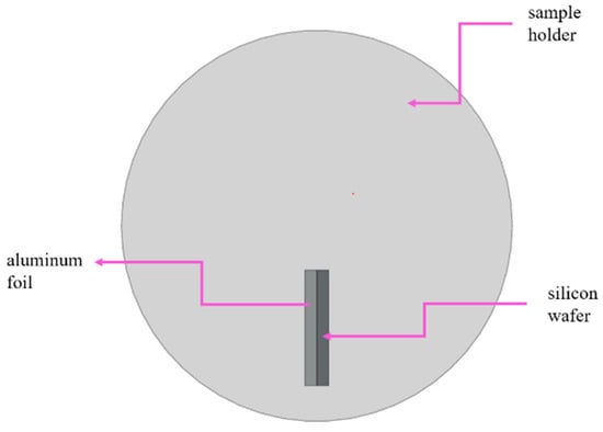 We first deposited a film on a silicon wafer under deposition conditions consistent with Table 1. In order to facilitate subsequent step tests, a 0.1 mm aluminum foil was used to cover the other half of the silicon wafer. Then, a stepped film in the radial direction of the substrate was obtained on the silicon wafer. The specific placement is shown in Figure 9. Furthermore, for the purpose of attaining better uniformity of the film thickness on the same circumference of the substrate, the sample holder rotated at a rate of 100 r/min. Meanwhile, based on the design of the mask and the deposition rate of the film without the mask, the sample holder also revolved around the center of the chamber for 48 revolutions at a constant speed of 0.018 r/s to achieve the desired film thickness distribution.