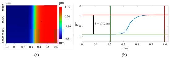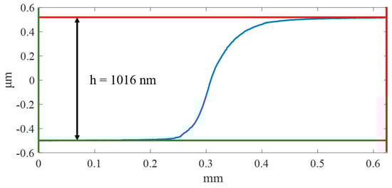 Thus, the question of how to confirm the degree of tilt is critical. Since the surface of the wafer used was ultra-smooth, the height profile of the surface was very flat in the area without any film coating. When the film was coated, the surface height fluctuations increased significantly because of rapid changes in surface height. It can be clearly seen in Figure 13b that the first derivative of the step height starts to change abruptly at x = 0.15 mm. Therefore, the uncoated area (the area to the left of the orange vertical line) can be confirmed. A straight line was used to fit the curve of the uncoated area to correct the height difference that comes from the tilt error as shown in Figure 13c. The actual height difference of this position was calculated to be 992 nm, which was 24 nm different from the 1016 nm obtained via direct measurement, improving the accuracy of test results.